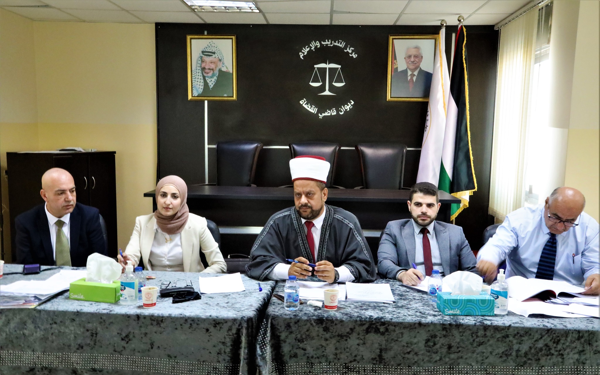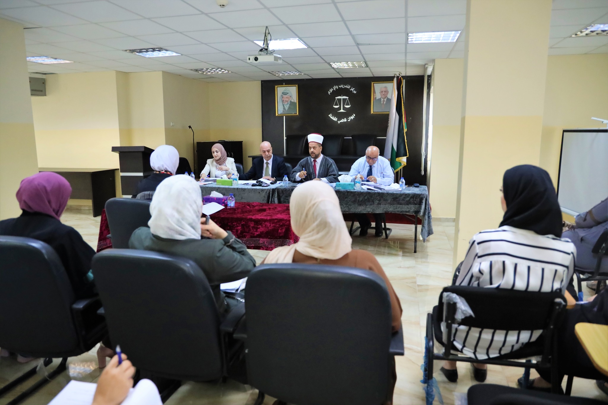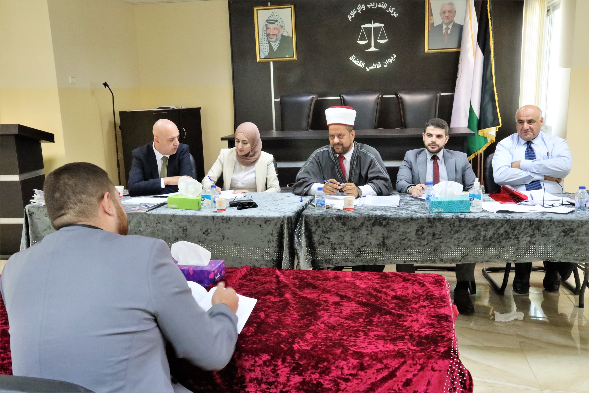 لجنة فحص المحامين الشرعيين في ديوان قاضي القضاة خلال مناقشة أبحاث مجموعة من المحامين الشرعيين الذين أنهوا فترة التدريب المنصوص عليها في قانون المحاماة الشرعية، تمهيدًا لمنحهم إجازة محاماة شرعية حسب الأصول، اليوم الأربعاء الموافق 23 / 8 / 2023.